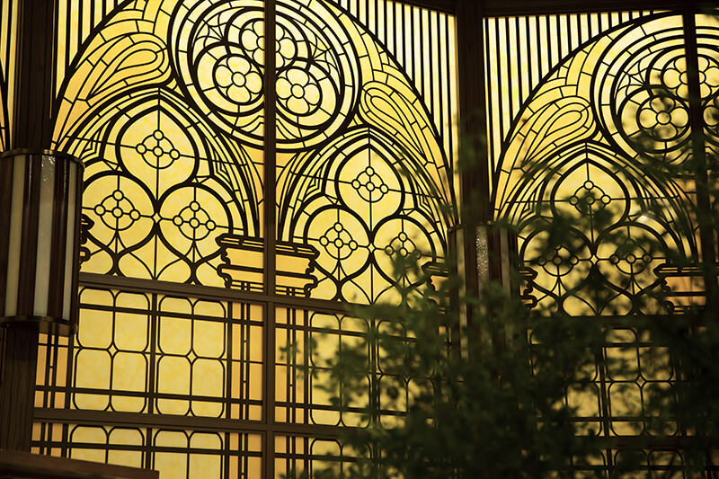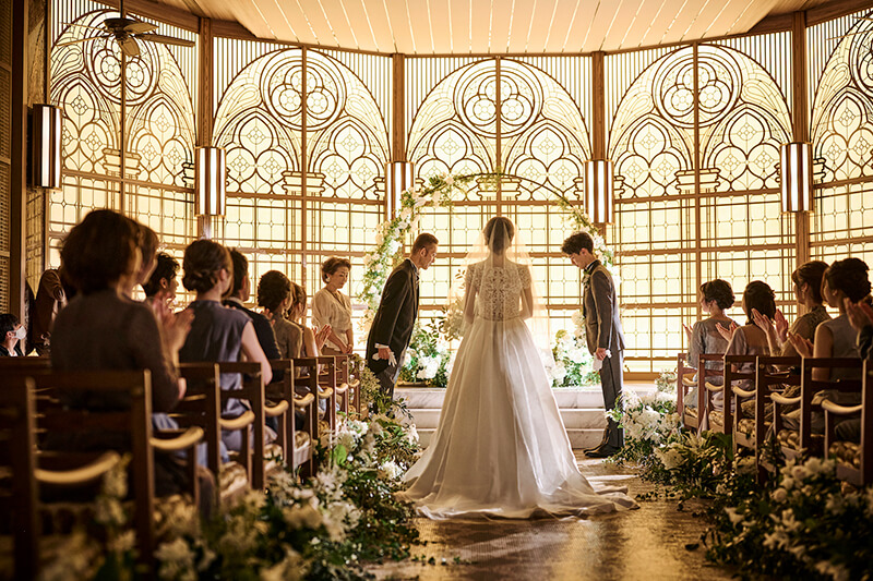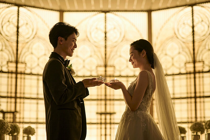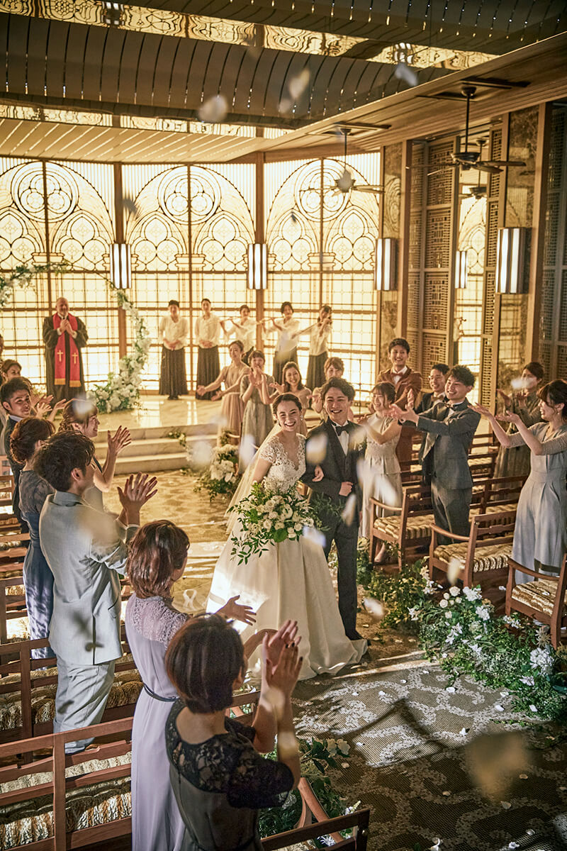 職人が丹精込めて手彫りで仕上げた彫刻が印象的。彫刻から差し込む聖なる光が誓いの瞬間を美しく彩る。デザインにも個性が光り、モダンかつ洗練された雰囲気を醸し出す。幻想的な光に祝福される感動的な誓いを。